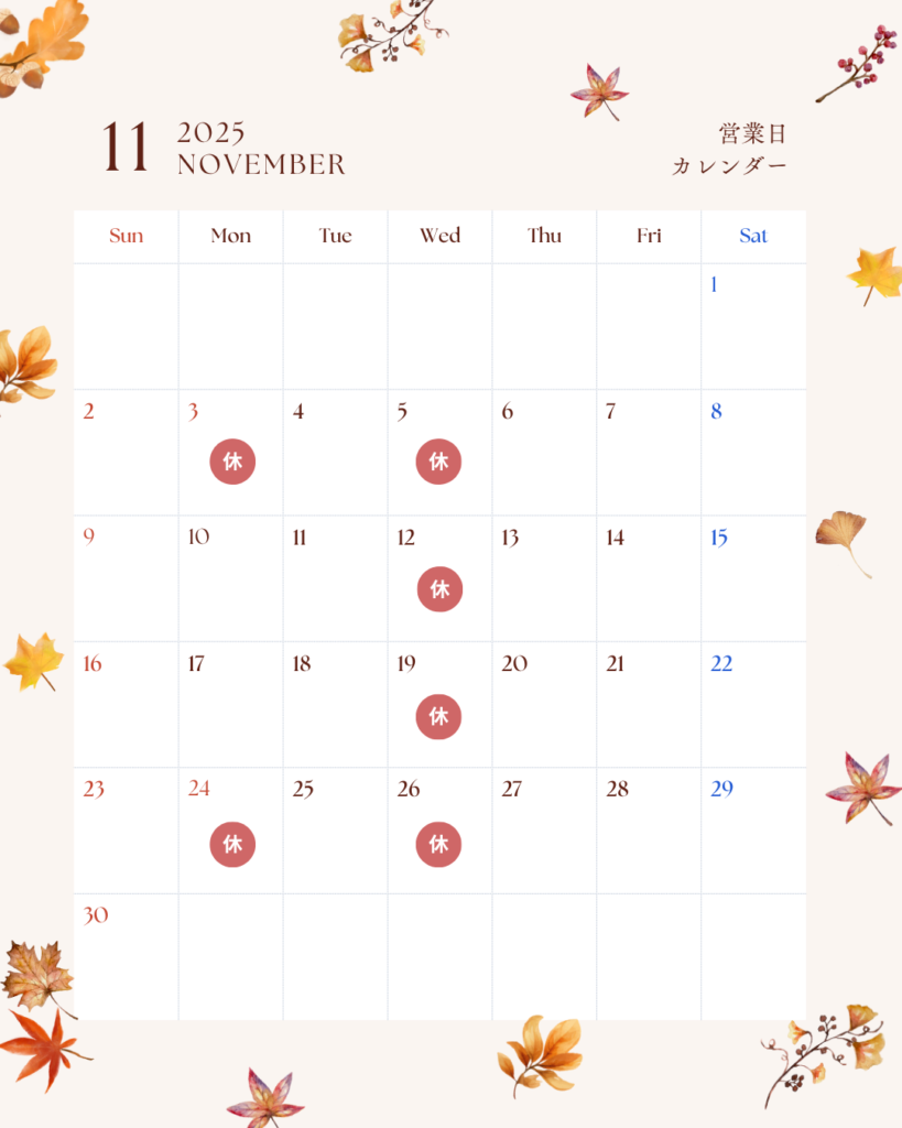 今月は、3日(月)と24日(月)が祝日定休日となります。
